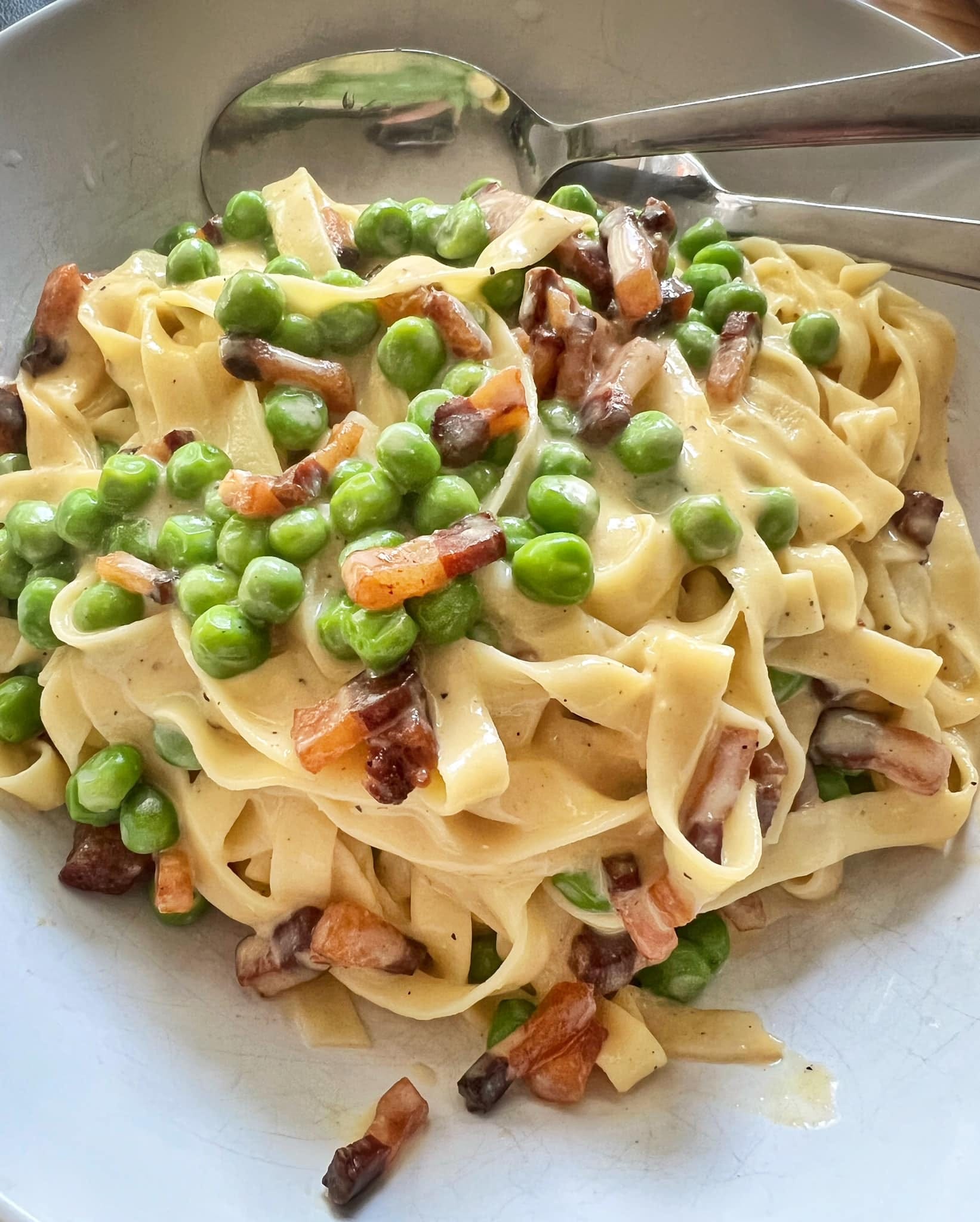 [Carbonara with peas, guanciale, and duck egg, and homemade pasta.]