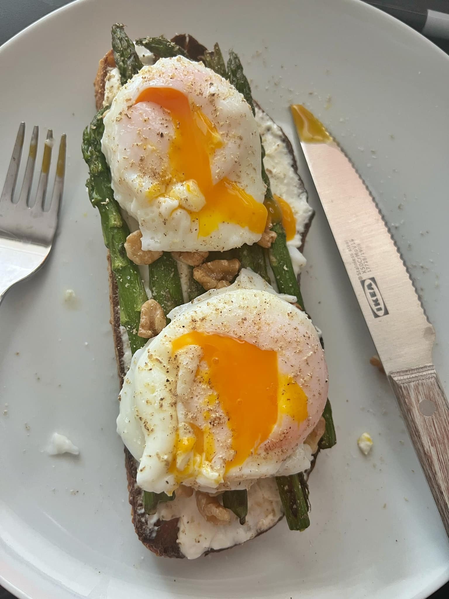 [A favourite breakfast now — walnuts, asparagus, and poached eggs on top of ricotta whipped with lemon zest and white pepper.]