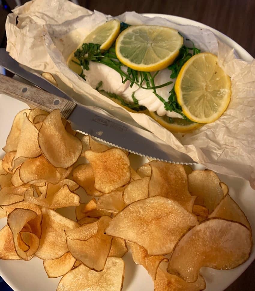 [Halibut en papillotte with lemon, herbs, and butter, plus homemade chips.]