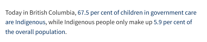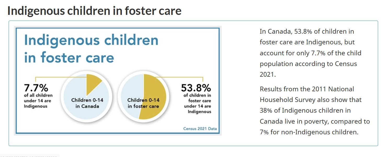 For instance, more than half the kids in foster care nationally are First Nations. Government stats prove it. A staggering 54% of kids in care in Canada in 2021 were Indigenous, and that doesn't address those scooped up by white families.