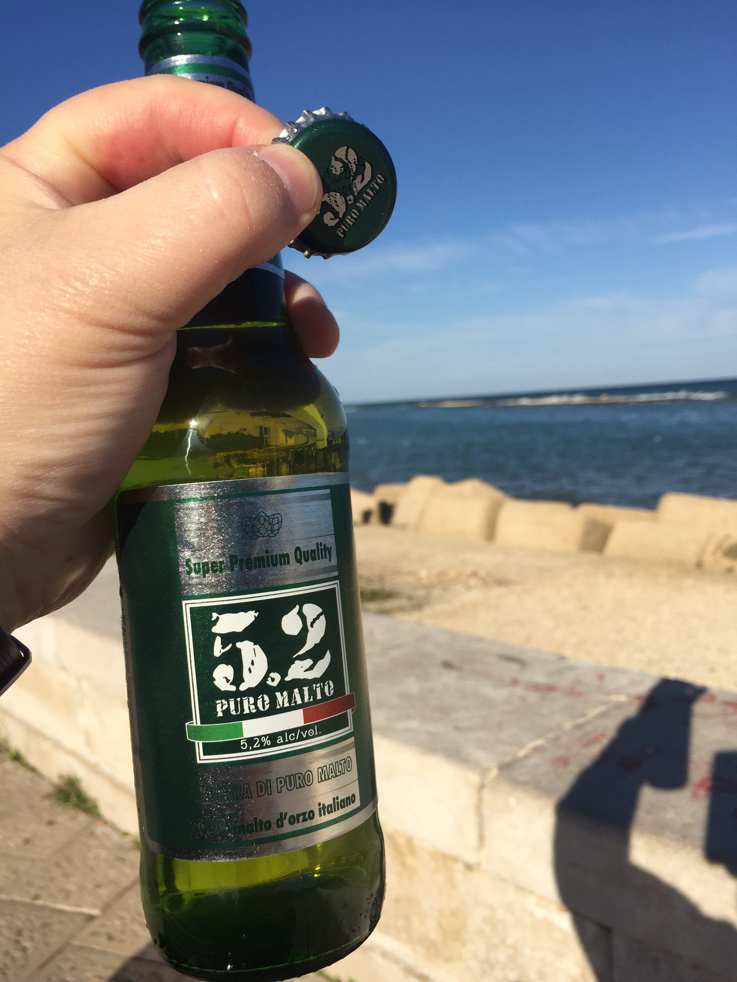 Photo: Doesn’t look like much to you, but it looks like victory to me — a rare wonderful day out. I was in Bari, Italy and had just seen the basilica where the body of Saint Nicholas, yes, Santa Claus, was interred. I thought it was a fine time to enjoy a beer and sit on the Mediterranean before continuing to see — and eat — more of Bari.