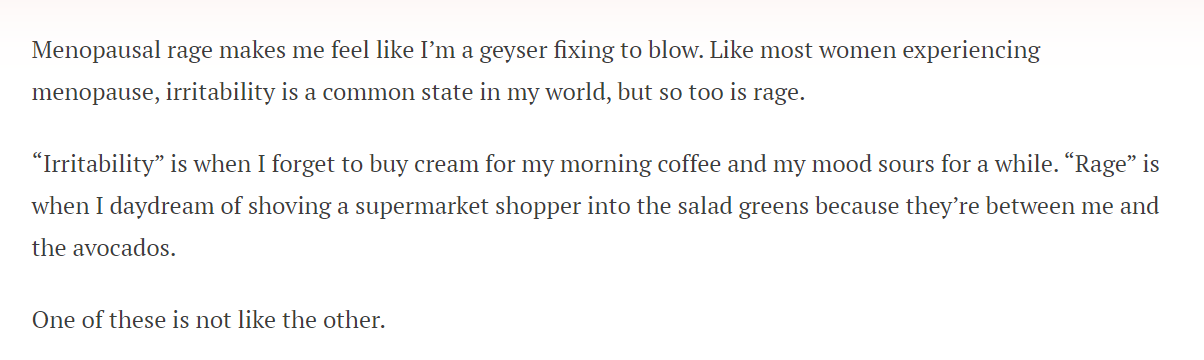 One client of late that I was proud to write for is a science-based women’s health company focused on menopausal health. They asked me to pitch some stories and I decided to pitch one about menopausal rage.
