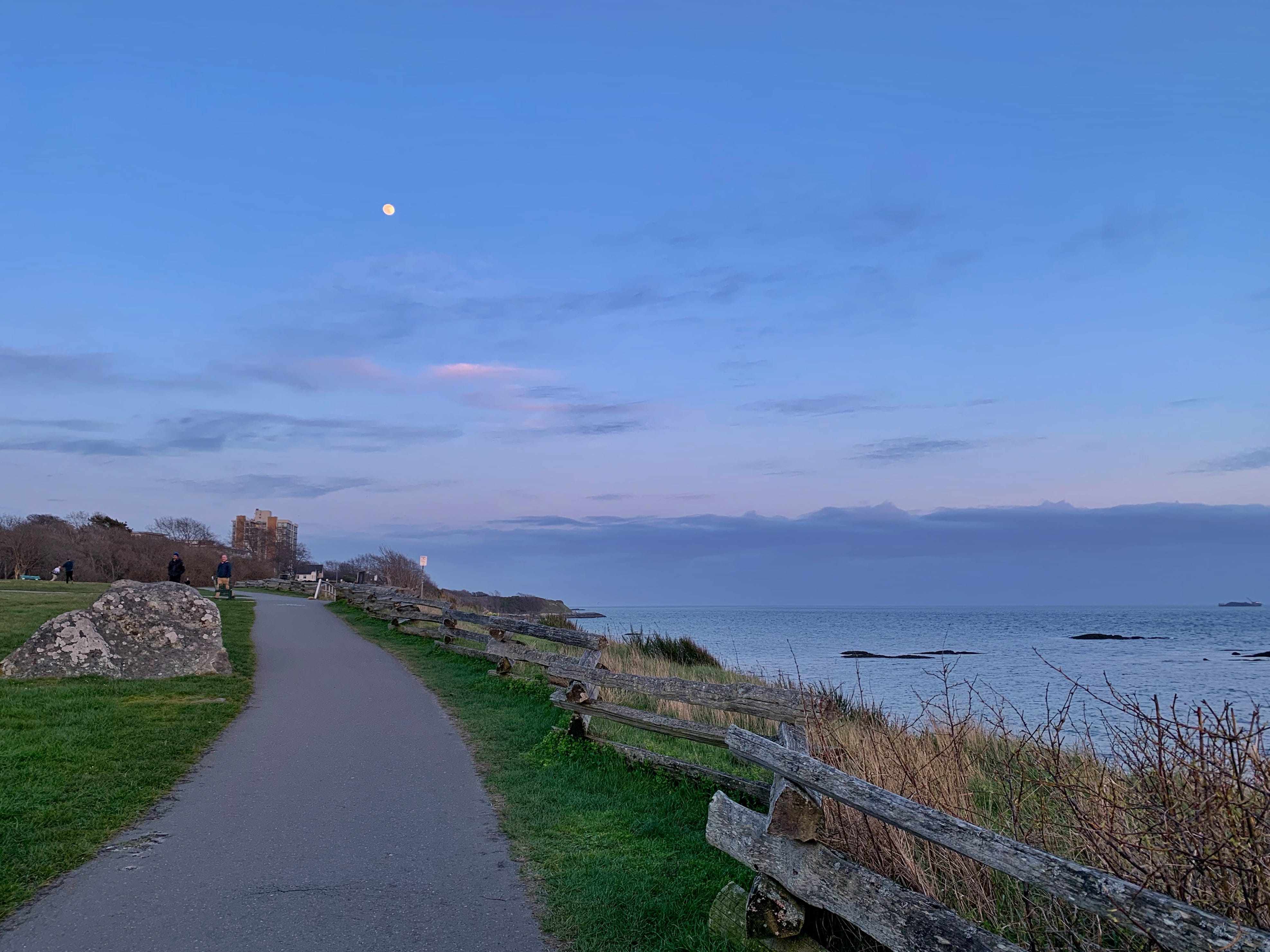 Photo: Moonrise at sunset. These days, sunset’s after 8pm. I’ve always become dormant after dinner, so it’s a bit of a struggle to shift that thinking and put on pants, shoes, and get out there. But the beauty makes it worth it when I succeed.