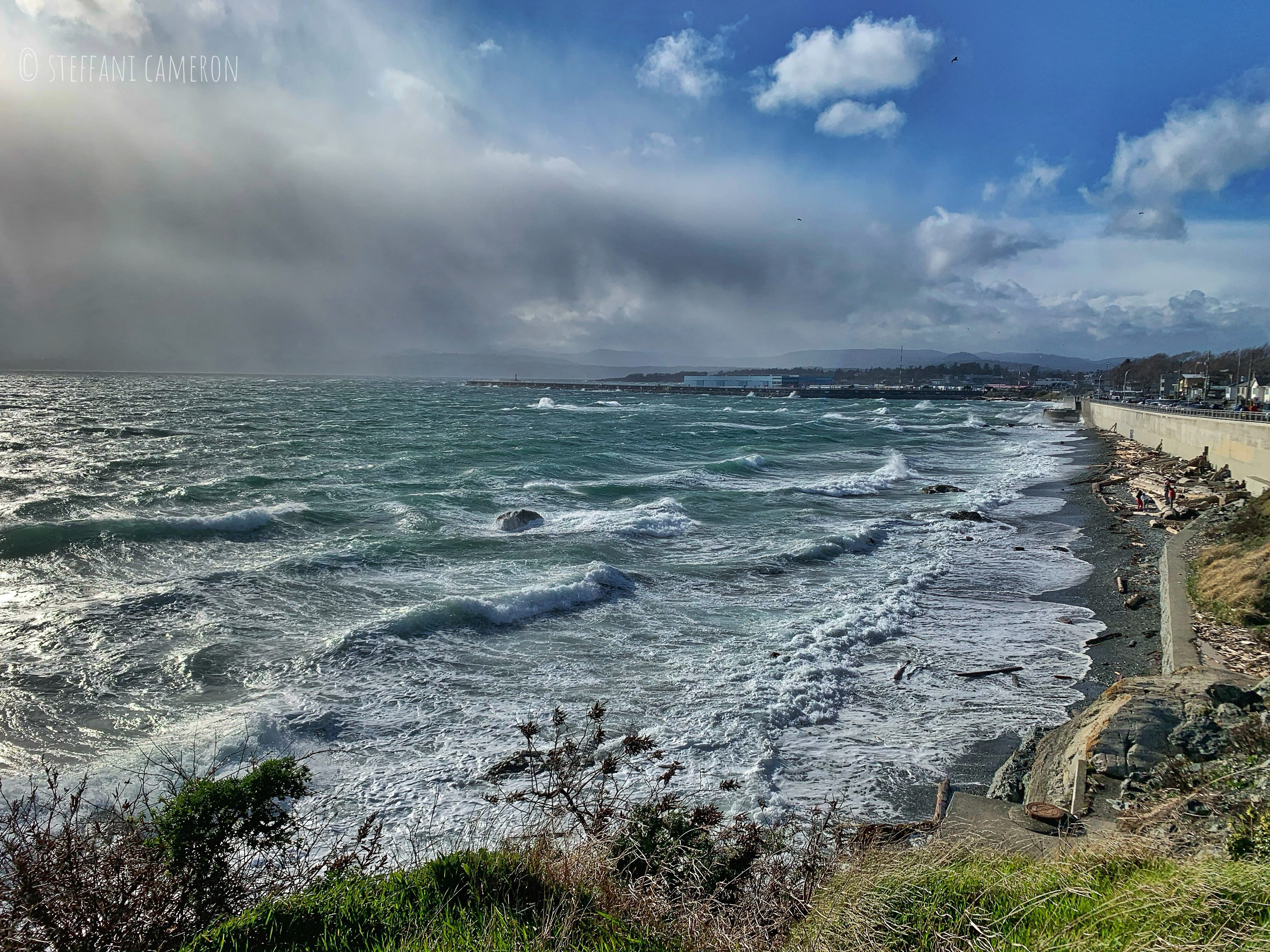 Photo: Speaking of clouds and time — I “timed” this walk perfectly, as a friend I’d baked some bread for was running late so we made plans to meet up later and I hustled out to get a look at the seaside with 90km/hr winds blasting. I tweeted this with the caption “something wicked this way comes,” while standing right there, then began my walk home — the rain opened up but stayed about 100-200 feet behind me the whole way home. Five minutes after I’d gotten home, a hailstorm unleashed and winds got stronger. It was a wonderful moment.
